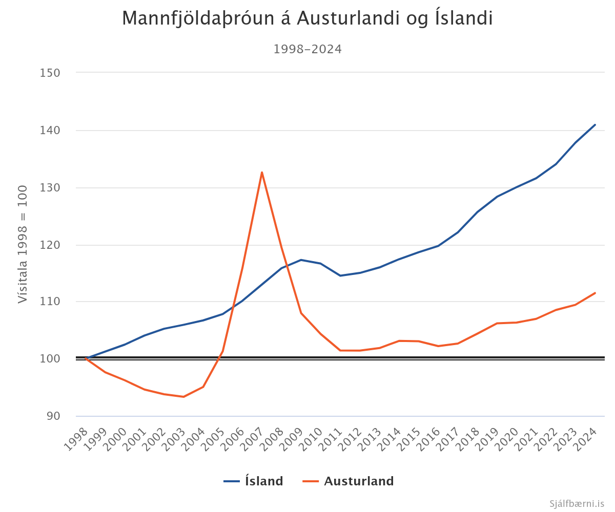 Íbúafjöldi á öllu tímabilinu hefur aukist á Austurlandi en hægar en á landsvísu. Áberandi er aukningin 2006-2008 vegna byggingar Fjarðaáls en fjöldinn tekur dýfu eftir að framkvæmdum lýkur áður en hann færist hægt og rólega upp á við að nýju.
