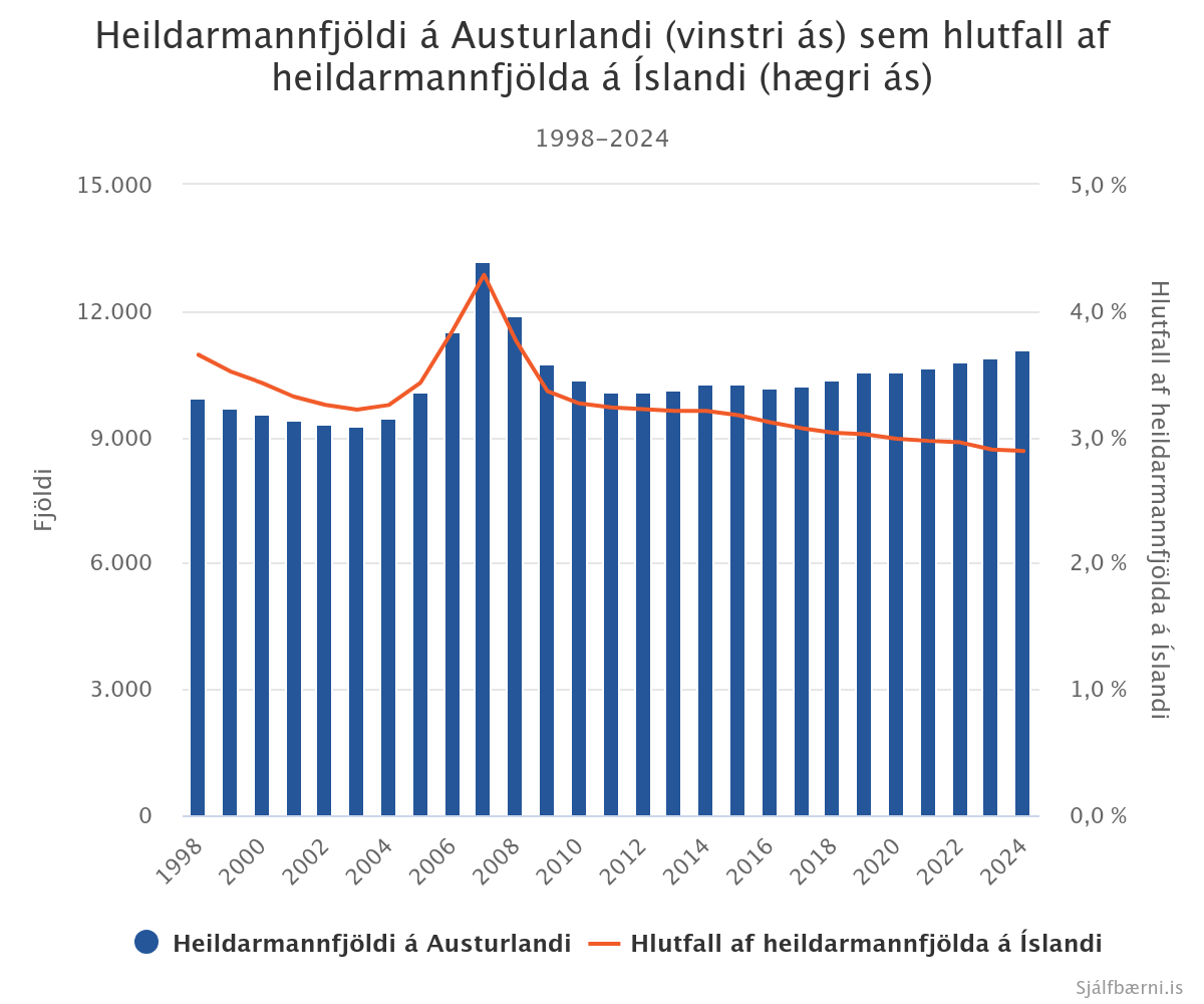 Mynd 2: Heildarmannfjöldi á Austurlandi sem hlutfall af heildarmannfjölda á Íslandi. Áberandi er að hlutfall Austurlands af heildarmannfjölda Íslands fer lækkandi með