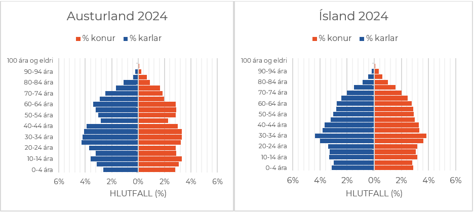 Mynd 5. Kynja- og aldurssamsetning íbúa á Austurlandi (Múlaþing, Fjarðabyggð, Fljótsdalshreppur og Vopnafjarðarhreppur) og Íslandi 1. janúar 2024.