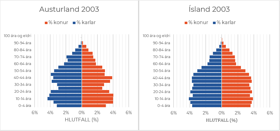 Mynd 4. Kynja- og aldurssamsetning íbúa á Austurlandi (Miðað er við sveitarfélagaskipan 1. janúar 2024; Múlaþing, Fjarðabyggð, Fljótsdalshreppur og Vopnafjarðarhreppur) og Íslandi 1. janúar 2003.